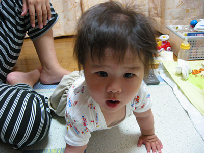 ![]() 6月 5日 ハイハイができるようになってきたよ. さあ,どんなワルサしてやろうかな.エヘヘ. |
