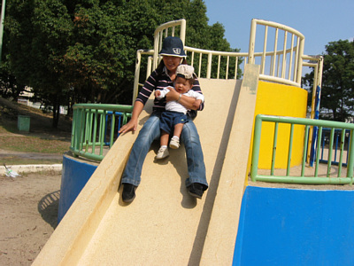 ![]() 10月14日 久宝寺緑地でコンクリートの滑り台に挑戦. いつもの滑り台より滑るから,ままも僕も少し怖がってるでしょ? |