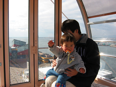 ![]() 1月 1日 天保山の観覧車は大きくって,高〜いとこまで行くから, ちょっと僕怖かったよ.あぁ,揺らさないで〜! |