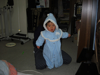 ![]() 1月14日 ベビー服を1年ぶりに着てみたよ.かわゆい? 僕もう赤ちゃんじゃないのに〜.まま,僕で遊んでるでしょ. |