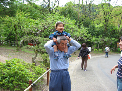 ![]() 4月27日 日本平動物園でじいちゃんに肩車してもらって上機嫌. これは100円玉何枚入れて動かしてるんだろう? |