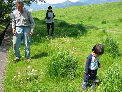 ![]() 4月29日 ままの実家の隣は安倍川の土手だから,理玖にとっては楽しい お散歩コース.タンポポの綿毛をたくさん飛ばして遊んだよ. |