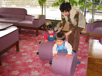 ![]() 4月30日 伊香保温泉の旅館のロビーで,到着早々玉転がしならぬ 椅子転がしであかりちゃんと競争したよ.負けないぞっ! |
