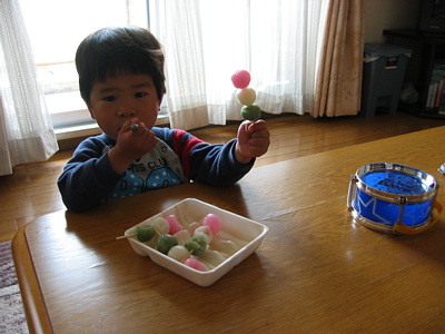 ![]() 4月 3日 大好きな団子を手にニコニコ.だけどよく見てください. 全部の串がちょっとずつ食べかけです(-。-;) |