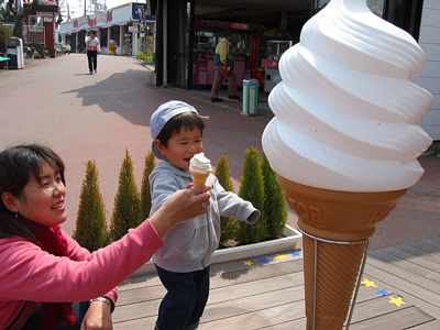 ![]() 4月 3日 ソフトクリームにはまってます.この看板と一緒だぁ! 絶対に買ってくれといいますが,食べるのはコーンの部分だけ. |