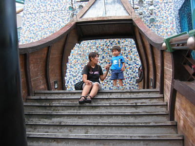 ![]() 7月17日 フェスティバルゲートのジェットコースターは間近で見れるので お気に入り.この船の階段でいつも2時間以上見てるんだよ. |