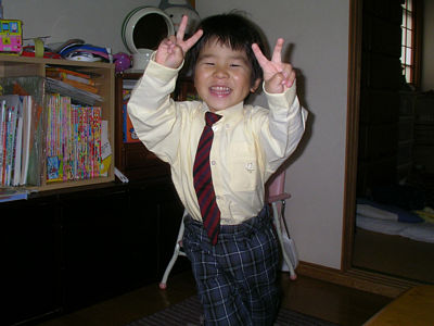 ![]() 4月15日 紀徒の結婚式用にかっこいい服を買ってもらったよ. どう,似合うでしょ? |
