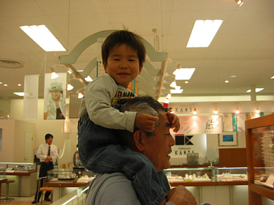 ![]() 5月 2日 ヨーカドーにて大好きなじいちゃんの肩車. 満足げなりくの顔とちょっと大変そうなじいちゃんの顔. |