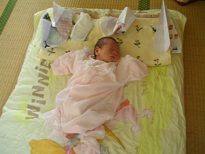 ![]() 8月22日 まだまだ寝てばかりの萌笑. 名前が無事決まって,やっと出生届を出せました. |