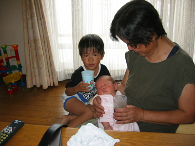 ![]() 9月 4日 ばあちゃんが公園で遊んでくれて暑かったので, シャワーしてジュース休憩.満足げなりく. |