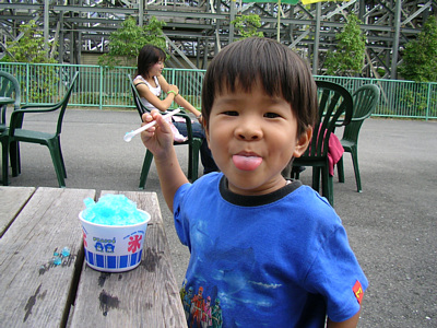![]() 10月 2日 ブルーのかき氷を食べて舌が青くなったよ. 後ろはお気に入りの木製コースター・アスカ. |