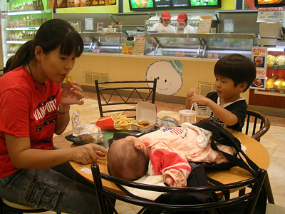 ![]() 10月 1日 カルフールでランチ中.大口あけ競争中の親子? こ,こ,こわい... |