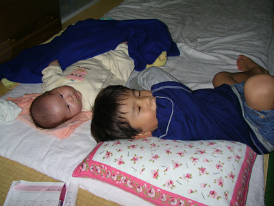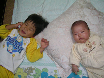 ![]() 11月10日 仲良し兄妹,夜寝るところ. カメラ目線の萌笑とわざと目をつぶるりく. |